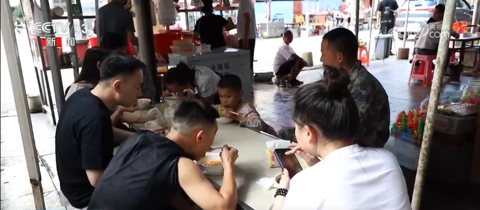 炉火持续加热时,要不停搅拌锅中的米浆,这个环节至少要坚持半小时。最后,滚烫的米浆通过特制漏斗淋入凉水中,瞬间凝固成细条状,在水中摆动时像一群游动的小虾。吃的时候舀入冰镇酸水,淋上秘制辣椒,撒把炒得香脆的黄豆,一碗消暑佳品就成了。